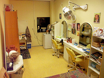 „Licht frisst Farbe“, ist eine alte Maskenbildner-Weisheit. Das heißt, wer bei Angelika Nickel auf dem Stuhl sitzt, wird so stark geschminkt, wie er sich niemals auf die Straße traute. Werner Hofmann, bekannt für drastische Sprüche, sagt hier: „Wenn's in der Maske ausschaut wie eine Fünf-Mark-Nutte, dann ist's auf der Bühne richtig.“ Auf diese Weise werden auch die männlichen Mimen ganz schön hergenommen mit scharfen Kajal-Schatten um die Augen, damit diese deutlich werden.
